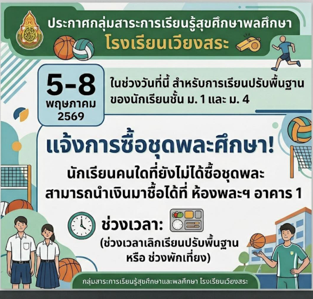📢 ยินดีต้อนรับสู่เว็บไซต์โรงเรียนเวียงสระ ❖ เรียนปรับพื้นฐานระหว่างวันที่ 5-8 พฤษภาคม 2569 ❖ ประชุมผู้ปกครองนักเรียน ระหว่างวันที่ 15-17 พฤษภาคม 2569 ❖ ติดตามข่าวสารและกิจกรรมของโรงเรียนได้ที่เว็บไซต์นี้ ❖ Welcome to Wiengsa School Website
