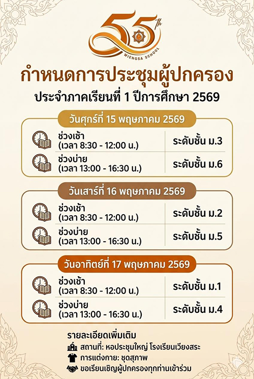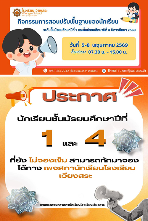 📢 ยินดีต้อนรับสู่เว็บไซต์โรงเรียนเวียงสระ ❖ เรียนปรับพื้นฐานระหว่างวันที่ 5-8 พฤษภาคม 2569 ❖ ประชุมผู้ปกครองนักเรียน ระหว่างวันที่ 15-17 พฤษภาคม 2569 ❖ ติดตามข่าวสารและกิจกรรมของโรงเรียนได้ที่เว็บไซต์นี้ ❖ Welcome to Wiengsa School Website